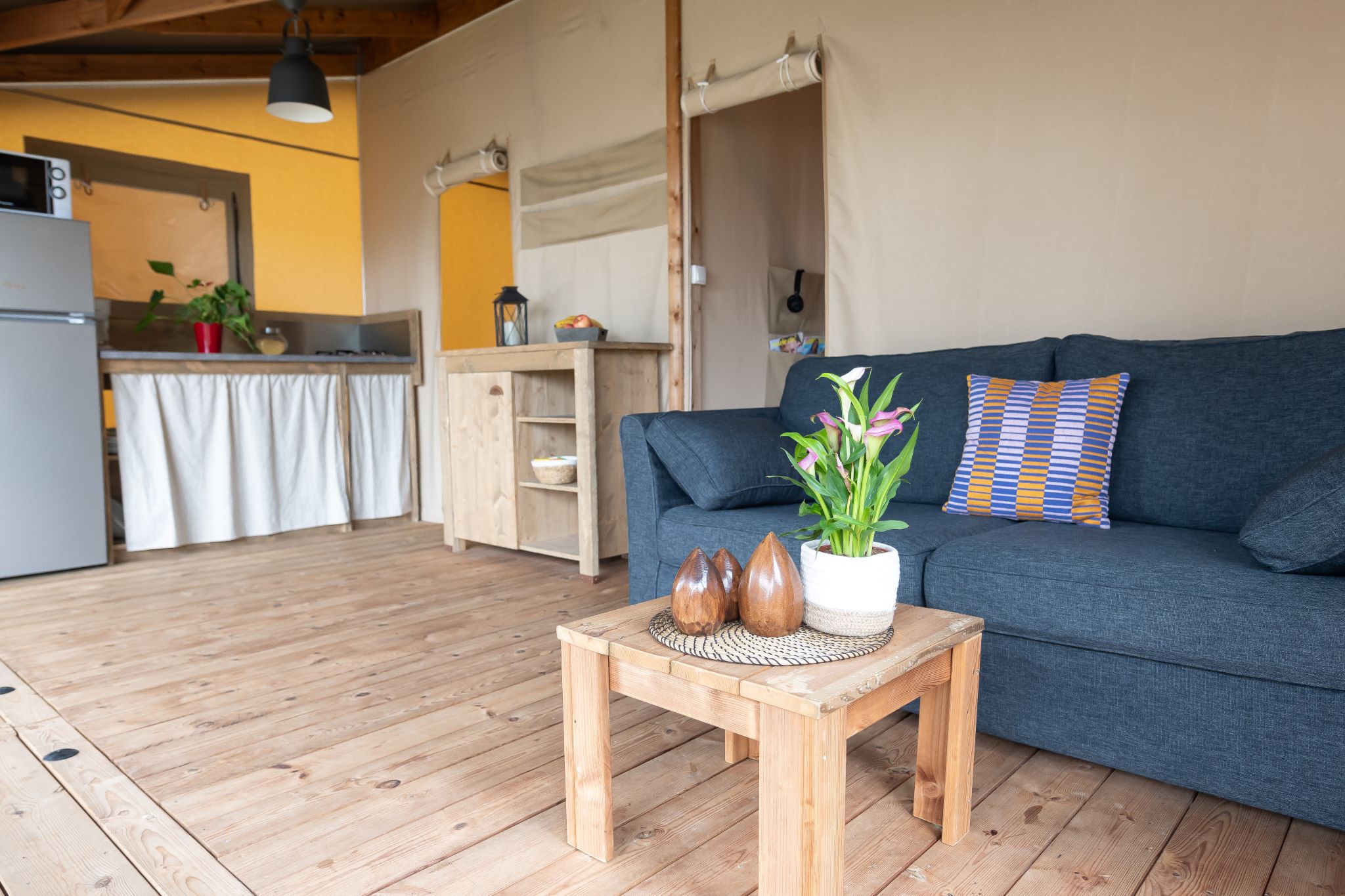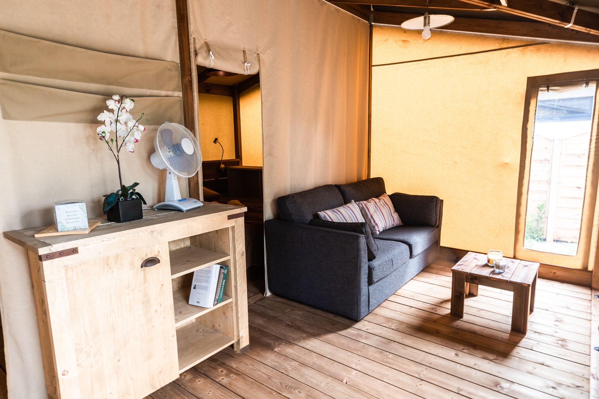 L'aménagement intérieur global, pratique, avec du rangement bien pensé, un grand frigo/congélateur, et même un canapé.